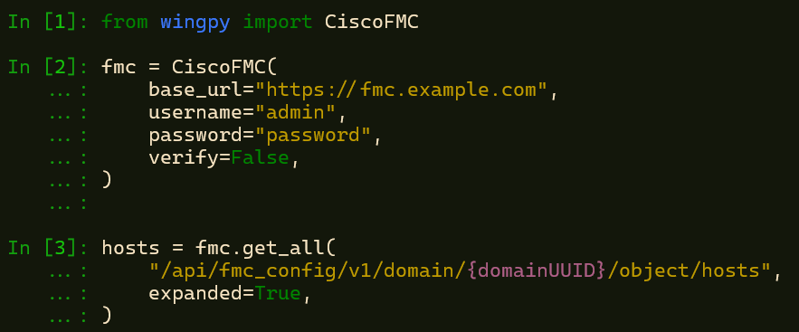 Lad os sige at du vil hente en liste med alle host objekter i Cisco FMC. Hvis du skal have en liste med alle objekter, ville du normalt skulle hente flere sider, men med wingpy er det så simpelt her: