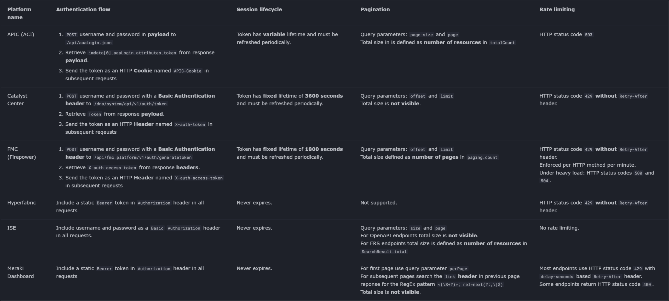 Cisco Platform API differences table