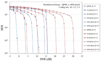 Nedenstående diagram viser BER (Bit Error Rate) versus SNR (Signal-to-noise ratio) for forskellige modulationer fra QPSK til 4096 QAM.